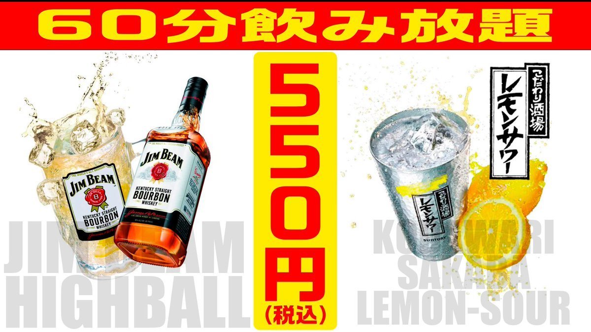 🍺ジムビームハイボール&こだわり酒場のレモンサワー飲み放題 550円(税込)